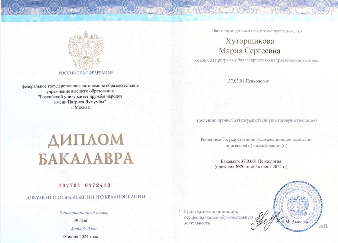 Высшее образование РУДН (психология), в процессе обучения в магистратуре НИУ ВШЭ (системная семейная психотерапия).